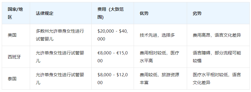 海外试管婴儿:前往允许单身女性进行试管婴儿的国家或地区,如美国、西班牙、泰国等。需要注意的是,海外试管婴儿涉及签证、语言、文化差异等问题,需要提前做好充分准备。