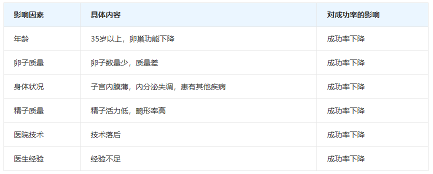 表格展示影响试管婴儿成功率的因素