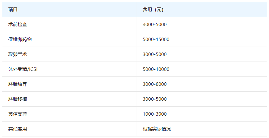 以下表格展示了试管婴儿的各项费用明细: